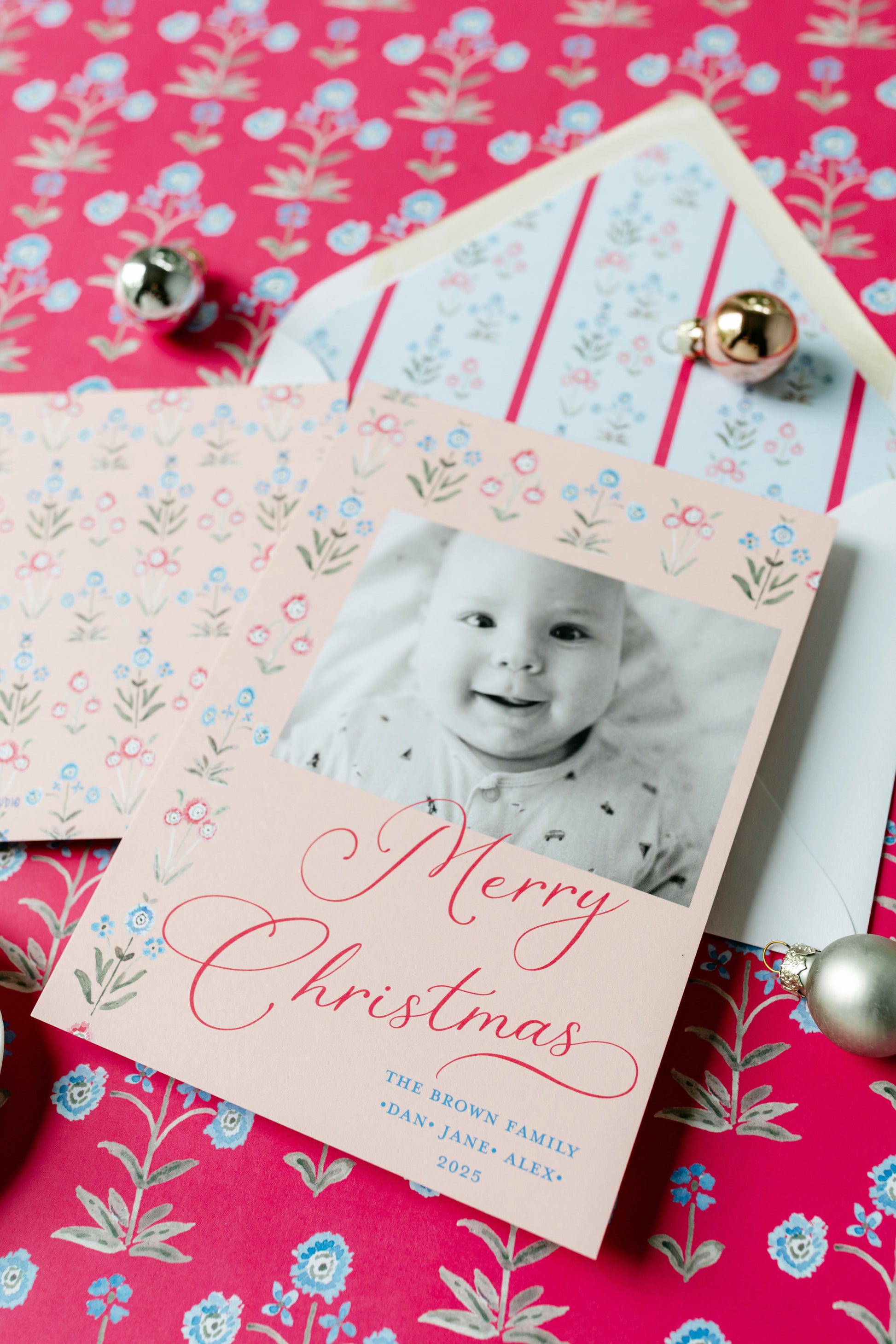 5x7 personalized Christmas card, printed on luxe 110 smooth paper. Blank white euro flap envelopes are included for no additional charge.