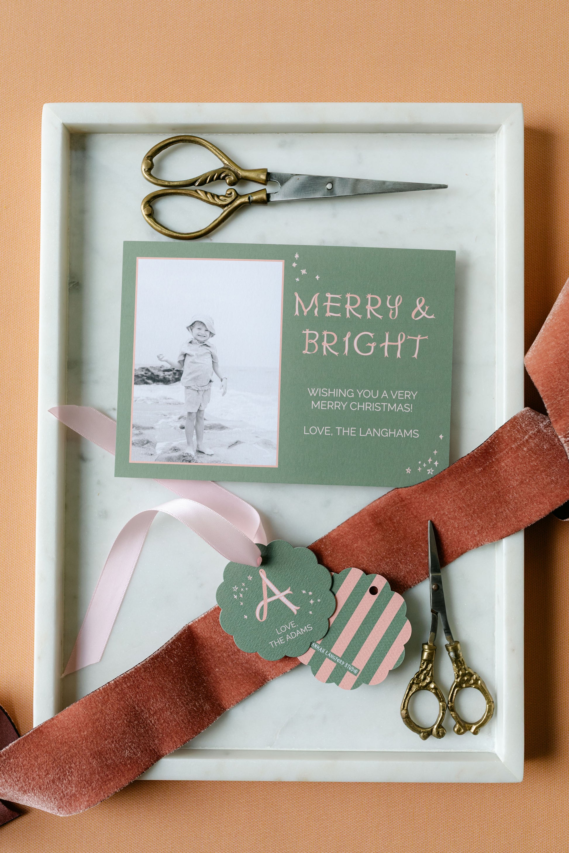Darling ribbon letters pair with a cheery color palette for this Christmas card design.