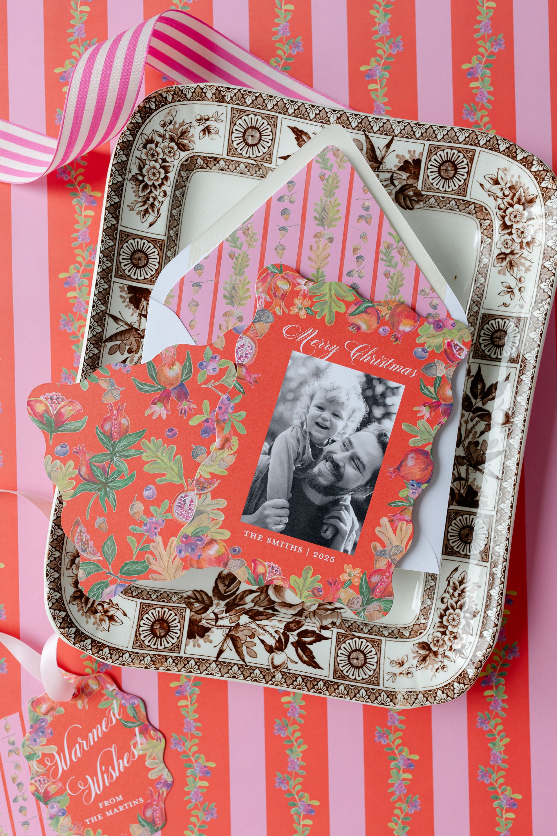 Rich, earthy colors pair with a playful scalloped edge for this unique Christmas card design!