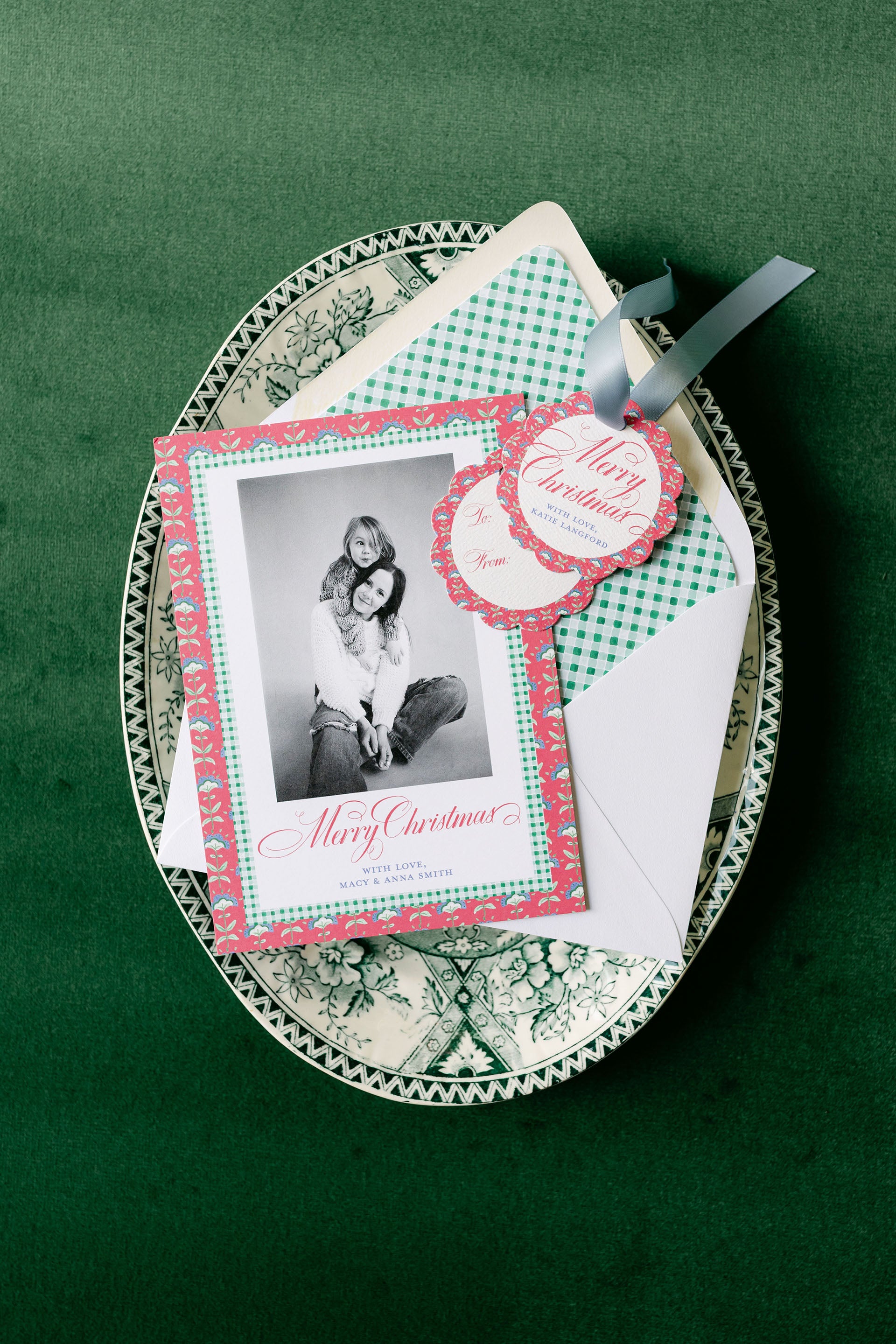 5x7 personalized Christmas card, printed on luxe 110 smooth paper. Blank white euro flap envelopes are included for no additional charge.
