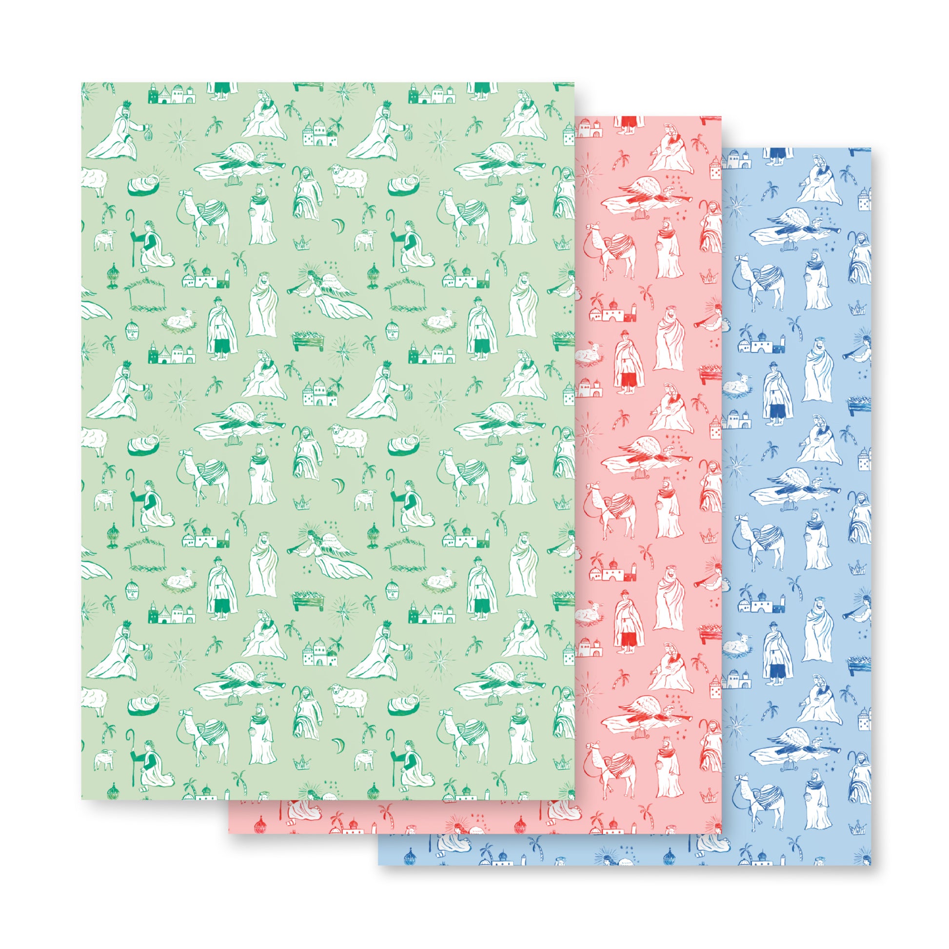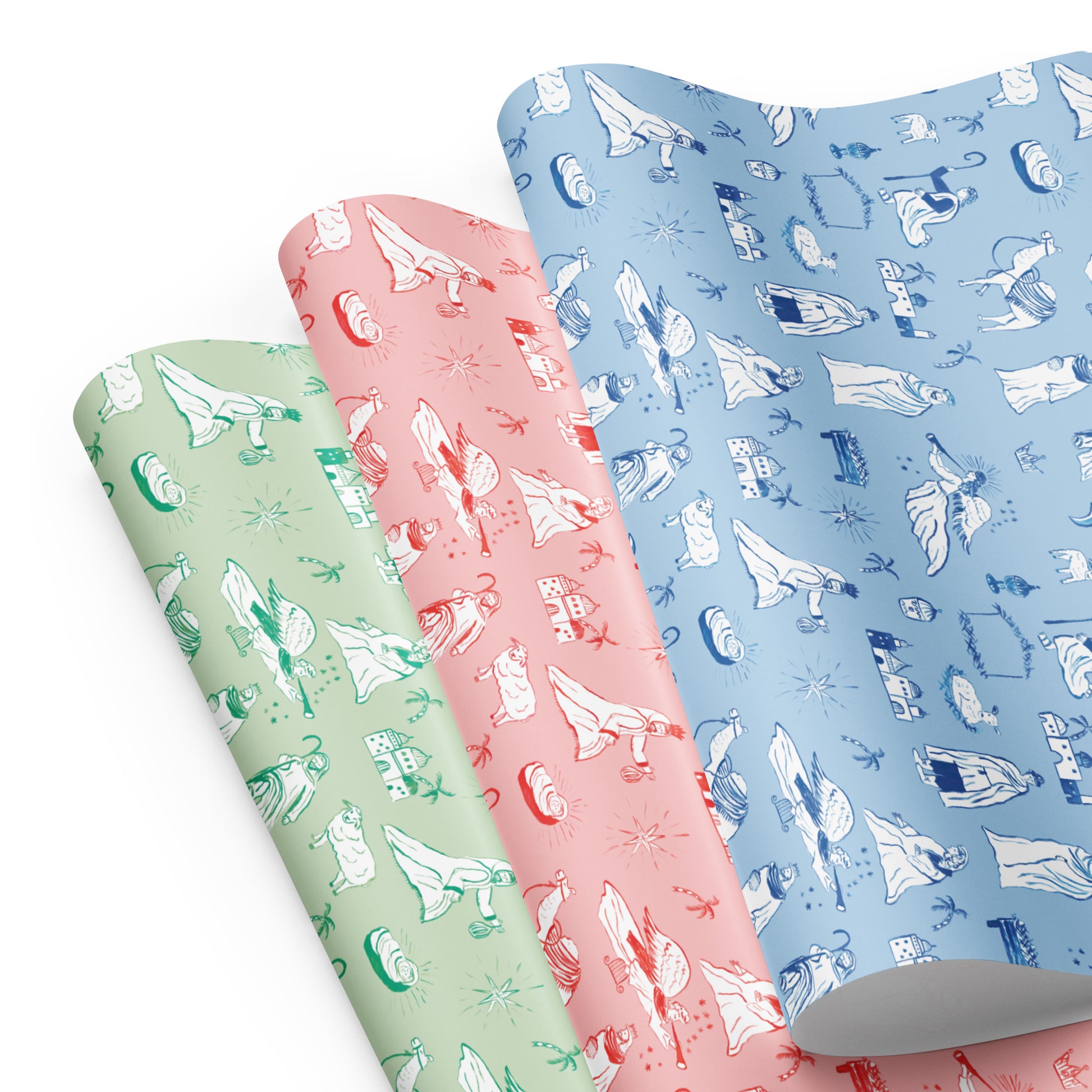 Nativity-inspired gift wrap in fun, modern colorways! Wrapping paper is printed to order as a set of 3 sheets. Sheet sizes are 28.75″ × 19.75″, printed on 70# uncoated text matte finish paper. Wrapping paper will ship rolled up in a tube for safe shipping. Wrapping paper will ship separately if you're also purchasing other items from this site.